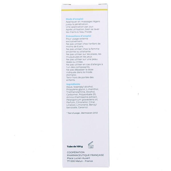 En effet, il est destiné aux adultes, aux adolescents et aux enfants à partir de 6 ans. Ce produit agit grâce à sa formule unique qui associe l’arnica au menthol. L’extrait d’arnica joue un rôle essentiel en aidant la peau à retrouver rapidement son aspect normal après un choc ou un coup. De plus, le menthol procure une sensation de fraîcheur qui atténue la douleur et réduit l’inflammation.