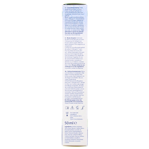 Sorbitol, silice hydratée, eau, glycérine, monofluorophosphate de sodium, isoceteth-20, xylitol, arôme hydroxyethyl cellulose, dioxyde de titane, gomme de cellulose, colostrum whey, saccharine de sodium, lactoferrin, lysozyme, potassium thiocyanate, sodium benzoate.