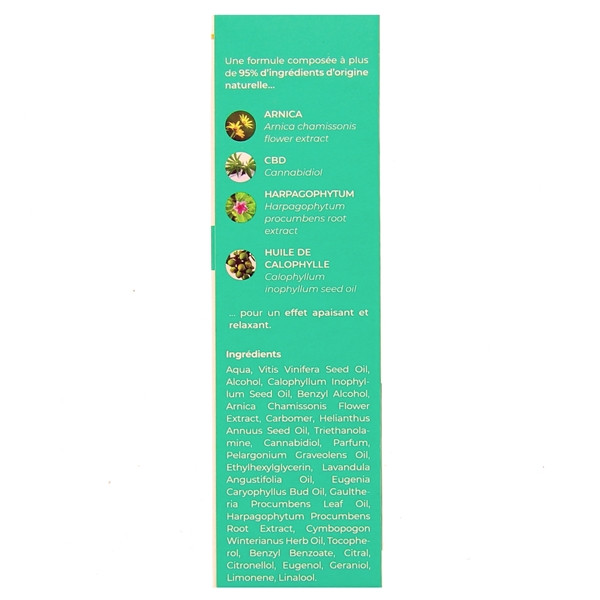 L’Arnican Massage CBD Roll-On est composé de 2 huiles végétales : l’huile de pépins de raisins et l’huile de calophyle. La première est connue pour ses vertus émollientes et antioxydantes tandis que la seconde possède des capacités tonifiantes pour la circulation sanguine. Ce gel de massage contient également de l’huile essentielle de gaulthérie aux propriétés anti-inflammatoires et antidouleurs. L’huile de romarin dans la formule de ce roll-on est un tonique destiné à apporter une stimulation. Ce dispositif de soin renferme aussi de l’huile essentielle de citronnelle de java, de clou de girofle, de géranium rosat et de lavande.