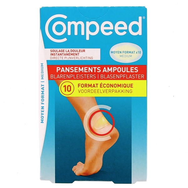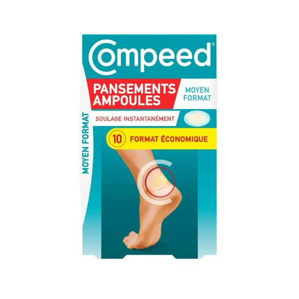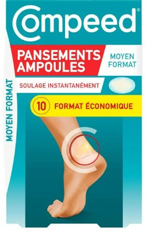 Le laboratoire Compeed propose le pansement Compeed, spécial ampoules, de format moyen, dans une boîte de 5 pansements.