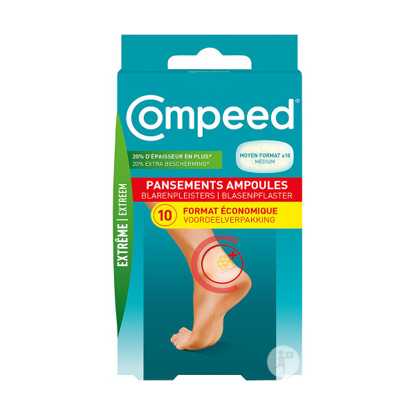 Découvrez le pansement pour ampoule Compeed, de la marque Compeed, spécial pour ampoule extrême. Proposé dans une boîte de 10 pansements de format Moyen.