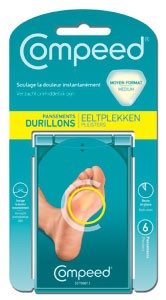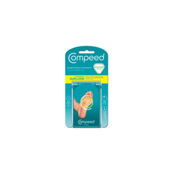 Le laboratoire Compeed fabrique les pansements Compeed spéciaux pour les durillons, présentés dans une boîte de 6 pansements.