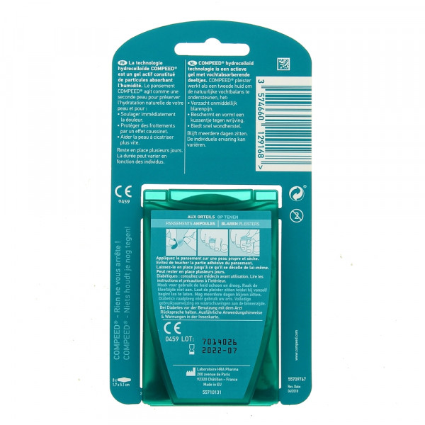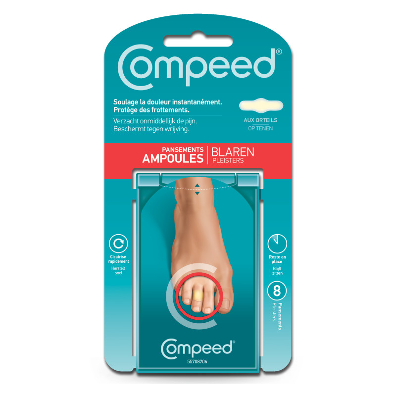 Le pansement Compeed, du laboratoire Compeed, est spécialement fabriqué pour soigner les ampoules au niveau des orteils. Intervenant comme une seconde peau, il calme instantanément la douleur.