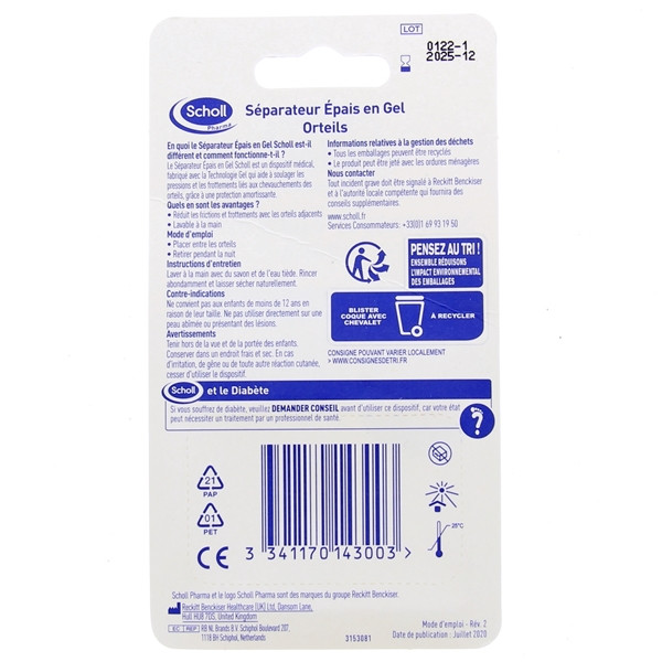 Le Séparateur Épais en Gel Orteils de Scholl a été développé par les chercheurs Scholl accompagné de podologue. Il soulage immédiatement les douleurs, pressions et frottements liées aux chevauchements d'orteils (1er orteil sur le 2ème, Hallux valgus).