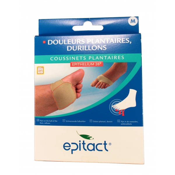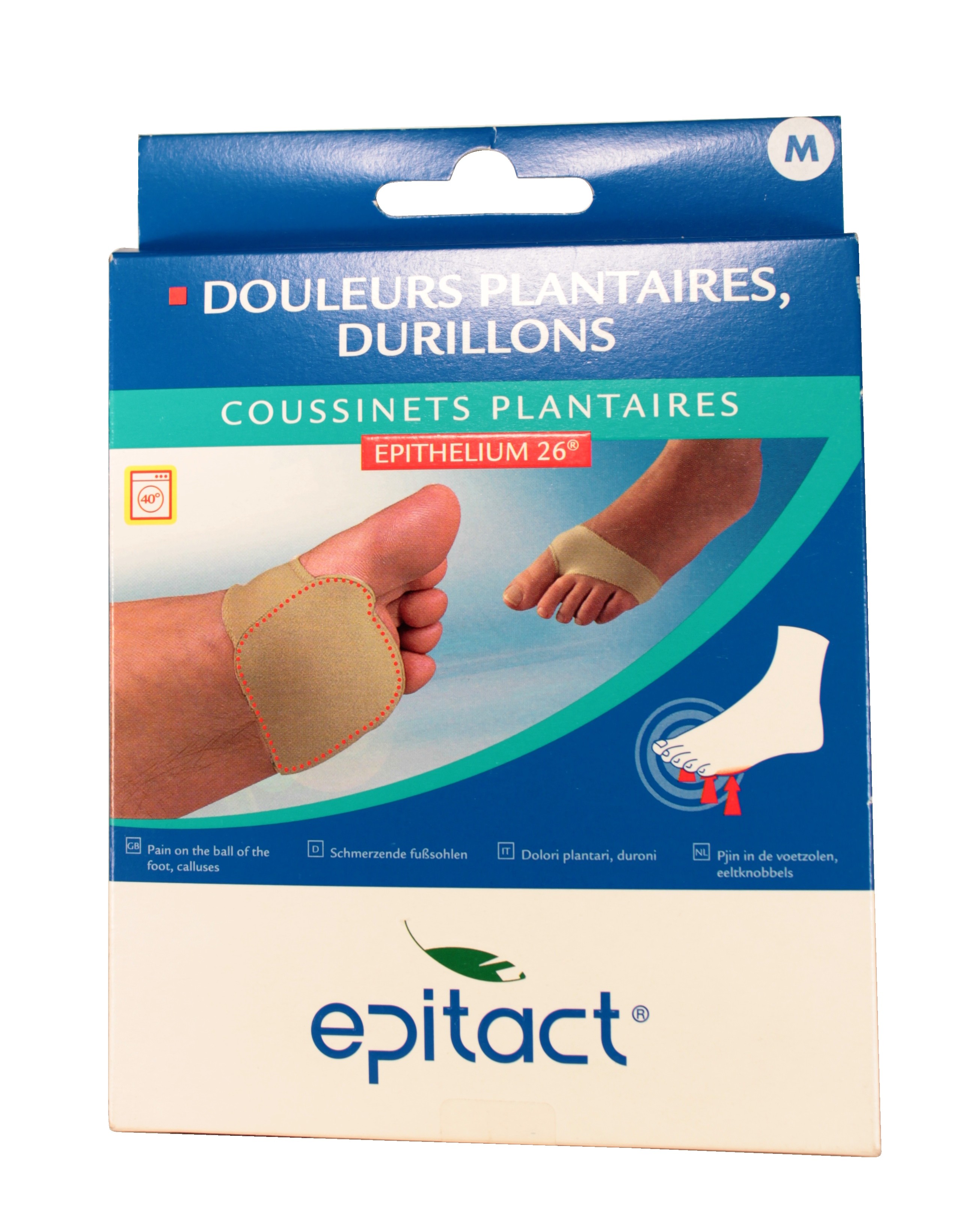 Coussin plantaire de protection à base d'Epithelium 26. Protecteur anatomique composé d'un gel souple entouré de tissu et muni d'une languette de retenue. Hypoallergénique, confortable, résistant, réutilisable, ne favorisant pas la transpiration. Absorbe les chocs, réduit les pressions et les frictions, soulage la douleur.
