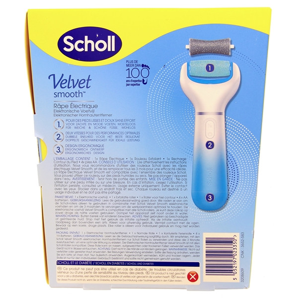 1 x Râpe Électrique anti-Callosités Scholl Velvet Smooth™ Bleue, 1 x Rouleau Exfoliant, 1 x Recharge contour du pieds, 4 x Piles de type AA.