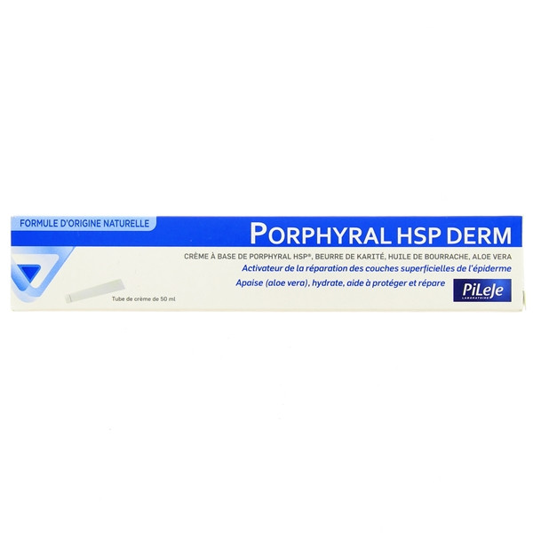 Porphyral HSP Derm du laboratoire Pileje est une crème formulé à base de Porphyral HSP, de beurre de karité, d'huile de bourrache et d'aloe vera pour activer la réparation des couches superficielles de l'épiderme et apaiser, hydrater, protéger et réparer la peau.