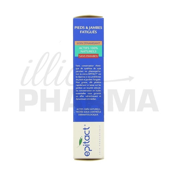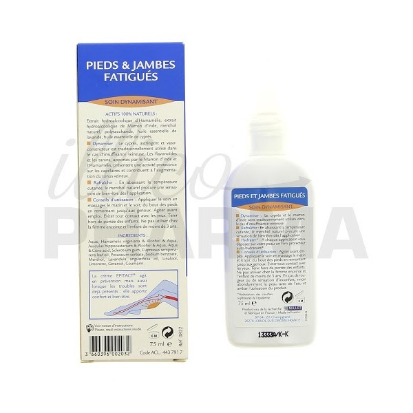 Le soin dynamisant des laboratoires Epitact utilise les vertus d'actifs d'origine naturelle pour stimuler les pieds et jambes fatigués. Ce soin dispose des propriétés rafraichissantes du Menthol pour calmer rapidement les sensations de fatigue. Les extraits végétaux de Marron d'Inde et d'Hamaméluis qui caractérisent ce soin favorisent la redynamisation du système vasculaire. Les extraits de pépins de pamplemousse que contient ce soin limitent les risques d'apparition des mauvaises odeurs et des mycoses sur les pieds. Le soin Dynamisant laisse un film naturel de polysaccharide sur la surface de la peau. Cet actif hydrate intensément l'épiderme.