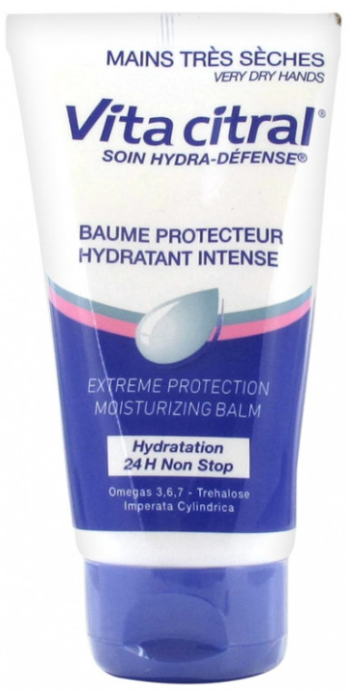 Le baume hydra-défense de la marque Vitacitral est un soin nourrissant et réparateur destiné aux mains sensibles et particulièrement sèches. Riche en oméga 3, 6 et 7, les essences d'Echium, d'Argousier et de pépin de raisin contenues dans ce baume restaurent la barrière protectrice naturelle de l'épiderme. Ce soin utilise l'action protectrice du Trehalose pour préserver les cellules cutanées du froid, de la chaleur, du stress et des risques de déshydratation. L'extrait de Baron rouge aide le baume hydra-défense à hydrater les mains en profondeur.