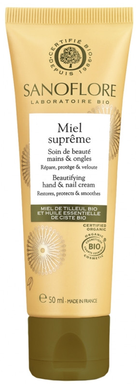 La crème Miel suprême de Sanoflore est une crème bio pour mains, renfermant un complexe Melifère et de l'huile essentielle de Lavandin bio. Les mains et les ongles sont hydratés, protégés et réparés avec ce soin.