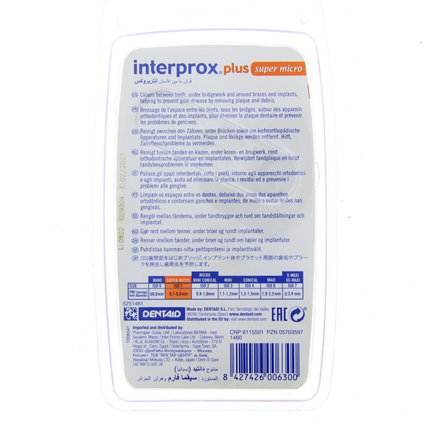Les brossettes Interprox Plus de format Super Micro permettent le brossage de l'espace entre les dents, les bridges, les couronnes, les appareils orthodontiques et les implants entre 0,7 et 0,8 mm de diamètre.