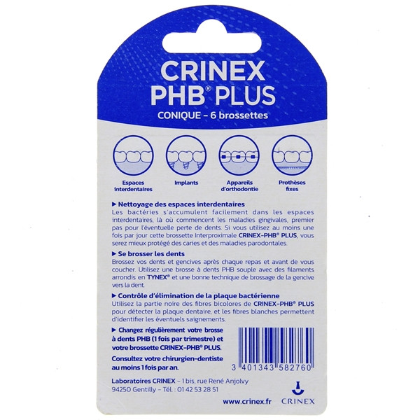 La brossette PHB Plus Micro a été spécialement conçue pour effectuer le nettoyage des espaces interdentaires. Présentée en format blister de 6 unités, elle est équipée d’une brosse de 2,4 mm de diamètre. Elle est aussi dotée d’une tige de 0,5 mm de diamètre. La brossette PHB Plus Micro est fabriquée par les laboratoires Crinex qui disposent d’un savoir-faire concernant l’hygiène interdentaire et le domaine pharmaceutique.