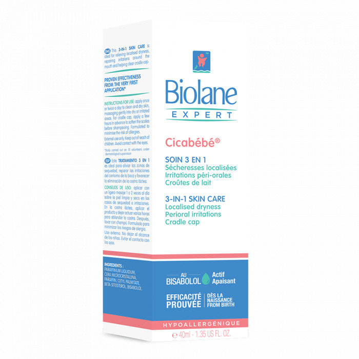 Cicabébé soin 3 en 1 hydrate et apaise la peau de bébé dès la première application. Sa formule enrichie en Inubiom, actif protecteur d'origine végétale, renforce et protège la peau de votre bébé. Il préserve l'équilibre cutané, pour une peau en pleine santé. Cicabébé 3 en 1 est disponible en tube de 40ml.
