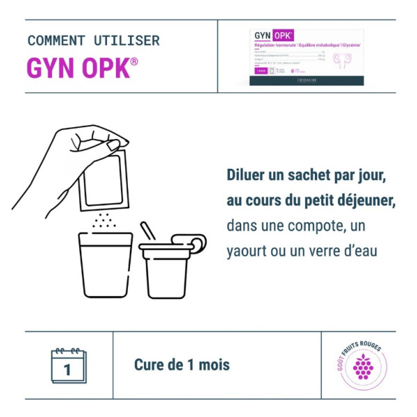 Gyn OPK Régulation Hormonale est indiqué pour favoriser l’équilibre hormonal et la fertilité chez les femmes atteintes de SOPK. Il est conseillé de prendre 1 sachet de ce complément alimentaire par jour pendant une cure de 1 mois. L’idéal est de diluer la poudre dans un verre d’eau, dans un yaourt ou dans une compote.