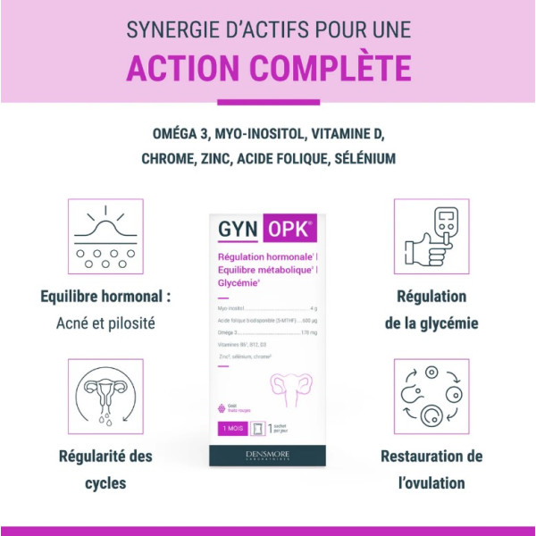 Gyn OPK du laboratoire Densmore est un complément alimentaire indiqué pour favoriser l'équilibre hormonal et la fertilité chez les femmes atteintes de SOPK. Gyn OPK offre une action complète en agissant sur la régulation hormonale, la régulation de la glycémie et l'équilibre métabolique.