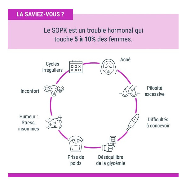 Gyn OPK Régulation Hormonale est un produit spécialement conçu par les laboratoires Densmore. Il est indiqué pour favoriser l’équilibre hormonal et la fertilité chez les femmes atteintes de SOPK (syndrome des ovaires polykystiques). Il s’agit d’un trouble hormonal provoquant différents symptômes : irrégularités des cycles, hyperpilosité, acné, prise de poids, stress, insomnie, etc. Invalidant, le SOPK impacte la qualité de vie et peut entraîner des difficultés à concevoir.