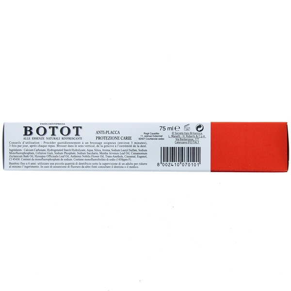 La pâte de dentifrice Botot combine des essences naturelles de cannelle, clou de girofle et menthe pour garantir la santé de la flore bucco-dentaire au quotidien. Elle offre une protection efficace contre les caries et les plaques.