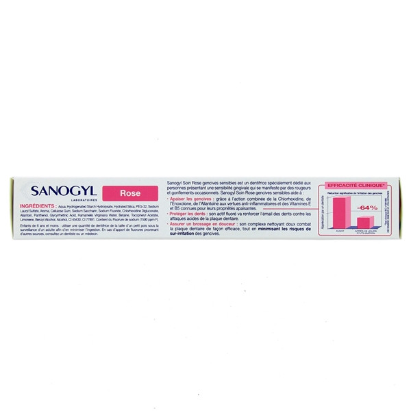 Le dentifrice Soin Rose des laboratoires Sanogyl est indiqué pour les gencives sensibles. Il se compose d'un complexe apaisant, de chlorhexidine et de fluor pour apaiser les gencives et protéger les dents.