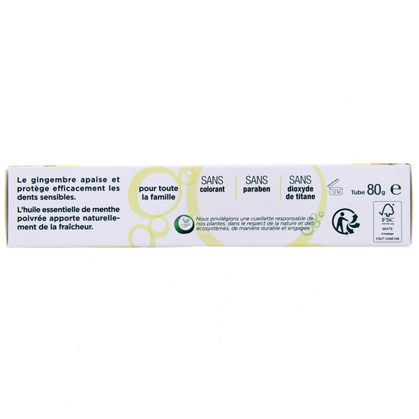Ce dentifrice est conditionné dans un format tube de 80 gr. Il est certifié bio et COSMOS ORGANIC par Ecocert Greenlife. D’efficacité prouvée, il s’agit d’une fabrication française.