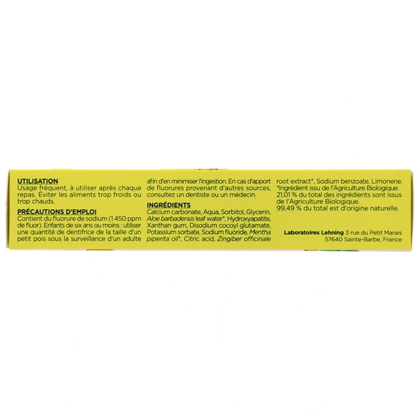 Pour y remédier, la marque Lehning propose une texture de pâte dentifrice enrichie de gingembre bio et d'huile essentielle de menthe poivrée pour un nettoyage tout en douceur. Le gingembre a l’avantage d’apaiser et de soulager la douleur tout en apportant une protection supplémentaire aux dents sensibles. Quant à l'huile essentielle de menthe poivrée, elle permet de garder la bouche saine et fraiche tout au long de la journée. Leur combinaison permet de profiter de propriétés antiinflammatoires, antalgiques et antioxydantes. Cela a aussi le don d’optimiser la protection des dents contre les caries et les bactéries.
