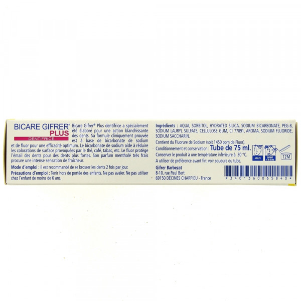 Grâce à ses composants, le dentifrice Bicare Gifrer Plus de la marque Gifrer Barbezat offre une action blanchissante tout en protégeant l'émail dentaire.