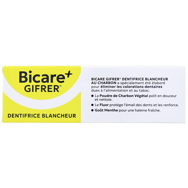 Bicare+ Gifrer Dentifrice Blancheur Charbon Végétal + Fluor est un dentifrice blanchissant qui nettoie efficacement les dents et aide à éliminer les colorations dentaires dues aux aliments, boissons et tabac. De plus, il apporte une protection des dents et des gencives.