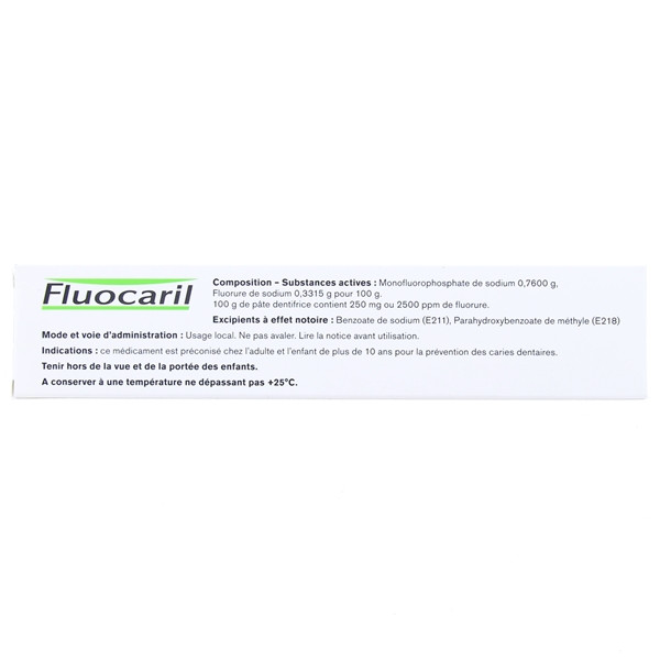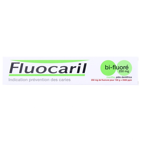 Le dentifrice Bi-fluoré 250 mg en pâte de Fluocaril est un médicament sans ordonnance contenant du fluor. Fluocaril est indiqué dans la prévention des caries.
