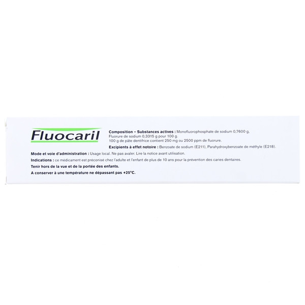 Ce dentifrice à haute teneur en fluor n'est pas destiné à être utilisé chez l'enfant de moins de 10 ans ; pendant la période de maturation des dents, un apport de fluor par voie orale est préférable (comprimés, sel fluoré, eau de boisson riche en fluor). Demandez conseil à votre médecin ou à votre dentiste.