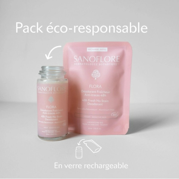 Le Déodorant Fraîcheur Anti-Traces 48 h Flora Bio de Sanoflore permet d'absorber l'humidité sous les aisselles et d'éliminer efficacement la bactérie responsable de la diffusion de mauvaises odeurs dans cette zone. Il convient à tous les types de peaux, même sensibles, dès 10 ans.