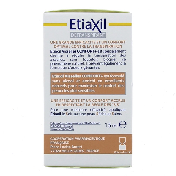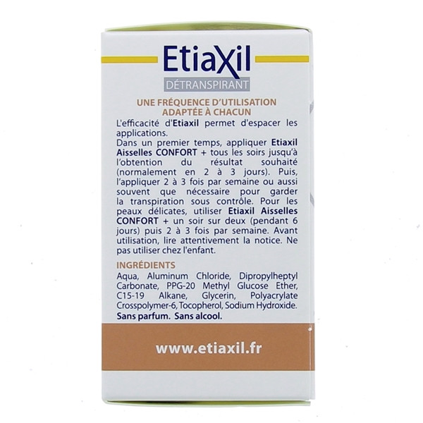 Etiaxil Confort+ fait partie de la gamme détranspirante, dont l’efficacité a été prouvée. Ce soin peut stopper la transpiration pendant 2 à 3 jours, tout en assurant une action anti-humidité et anti-odeur. Formulé sans parfum, ce dispositif est compatible avec l’utilisation d’un déodorant ou d’un parfum au quotidien. Il est enrichi en émollients naturels permettant de garantir le confort de la peau, même les plus sensibles.