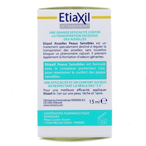 Le laboratoire Etiaxil crée le détranspirant Etiaxil, spécialement conçu pour les peaux sensibles. Présenté sous forme de déodorant bille de 15 ml. Grâce à l'action du chlorure d'aluminium, le déodorant Etiaxil assure une fonction antibactérienne. De plus, ce détranspirant en bille intervient directement et efficacement au niveau des glandes sudoripares, pour réguler la sudation des aisselles sans toutefois empêcher ce phénomène naturel. Ce produit élimine également les odeurs gênantes. Grâce à une formule unique, ce soin est recommandé par les spécialistes en cas de transpiration excessive.