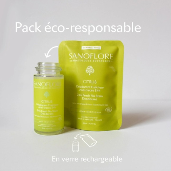 Le Déodorant Fraîcheur Anti-Traces 24 h Citrus du laboratoire Sanoflore est certifié bio et rechargeable. À 99 % d'origine naturelle, ce déodorant est adapté aux peaux sensibles et aux fortes transpirations. Il permet d'éliminer la transpiration et les odeurs gênantes des aisselles tout en offrant une sensation de fraîcheur.