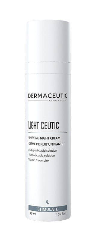Disponible sous forme de flacon de 40 ml, la crème de nuit unifiante LIGHT CEUTIC de Dermaceutic présente une formule à base :