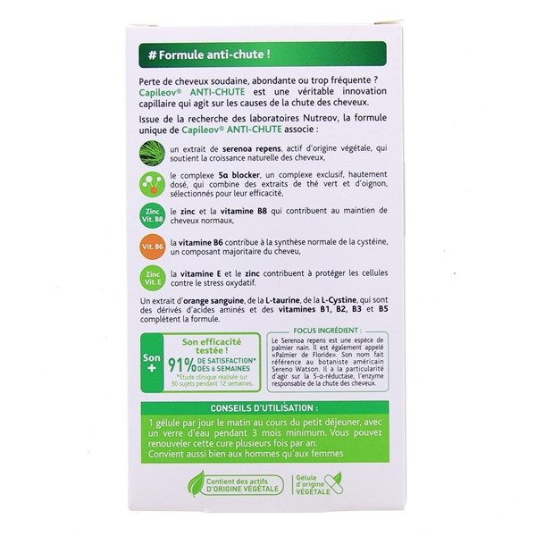 Le complément alimentaire antichute de la gamme Capileov bénéfice d'une formule double action : sur la genèse capillaire et le bulbe capillaire. Ce complément alimentaire élaboré par le laboratoire Nutreov Physcience puise dans la propriété stimulante du Serenoa Repens pour soutenir la croissance naturelle de la chevelure. La cystine, composant essentiel de la kératine, est synthétisée par la vitamine B6 présente dans ce complément alimentaire. La vitamine B8 et le Zinc permettent au complément alimentaire de redonner volume et éclat aux cheveux.