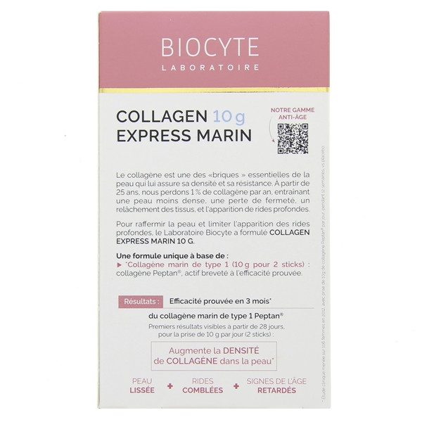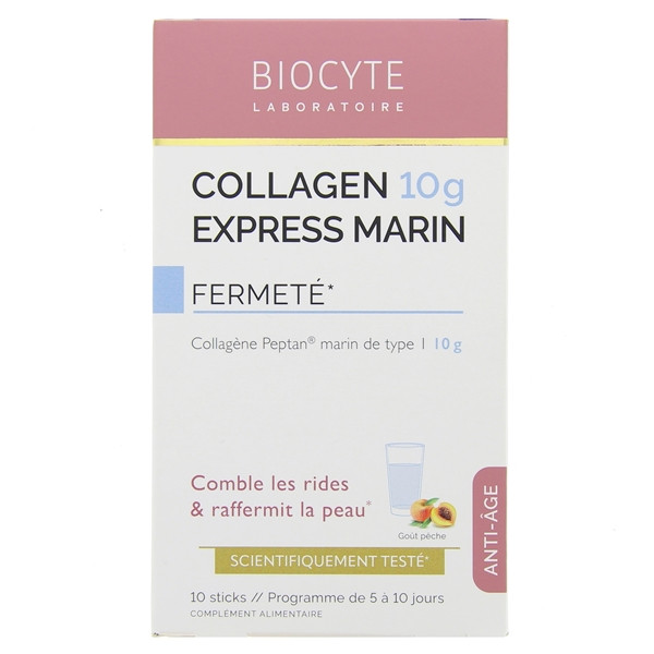 Biocyte Collagen Express Marin 10g Fermeté est un complément alimentaire à base de collagène, spécialement formulé pour les personnes à partir de 35 ans ayant des rides installées ou souhaitant prévenir les signes de l'âge.