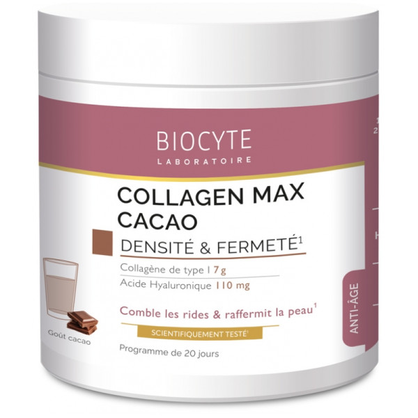 Collagen Max Cacao 260g a été spécialement développé par Biocyte à l’intention des personnes de plus de 35 ans qui souhaitent combattre les premiers signes du vieillissement cutané, comme l’apparition de rides et la perte de fermeté de la peau. Présenté sous forme de poudre pour boisson, ce complément alimentaire délicatement aromatisé au cacao est agréable à consommer.