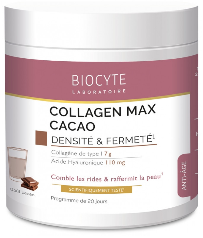 La formule de Biocyte Collagen Max Cacao inclut une forte concentration de collagène et d’acide hyaluronique. Ces composants contribuent à améliorer la résistance de la peau contre les agressions exogènes qui accélèrent son vieillissement. Ils accroissent également la densité cutanée. L’association des propriétés de ces ingrédients participe à la compression des signes de l’âge et aide à retrouver une peau lisse et repulpée. Ce complexe contient aussi de la vitamine C et de la vitamine E qui garantissent le fonctionnement normal de la peau et prémunissent les cellules contre le stress oxydatif. Présentation : pot de 260g de poudre au goût cacao.