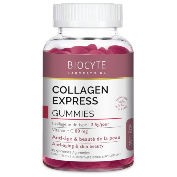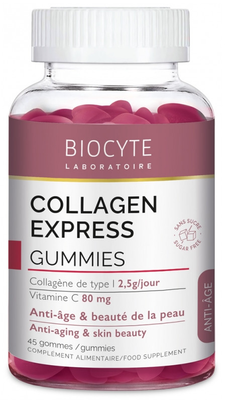 Biocyte Collagen Express Gummies est un complément alimentaire sans sucres sous forme de gummies qui apporte une action anti-âge & beauté de la peau grâce au collagène et à la vitamine C.