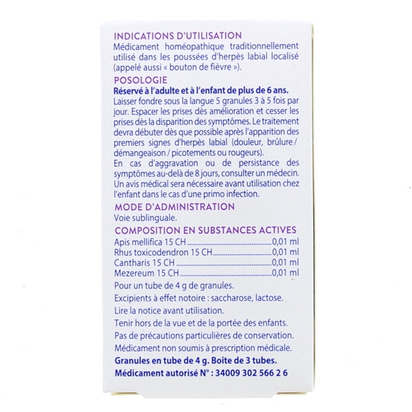 Le médicament homéopathique Labiameo Granules du laboratoire Boiron est indiqué pour les poussées d'herpès labial localisé (bouton de fièvre).