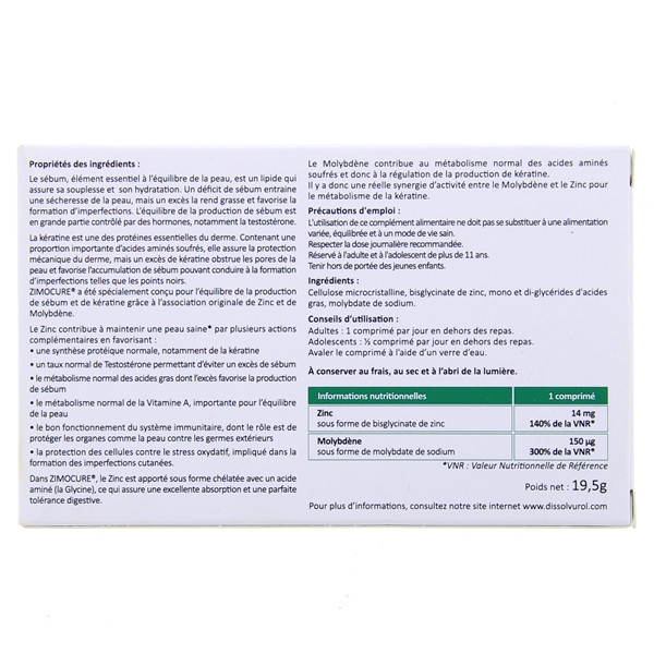 Zimocure du laboratoire Dissolvurol est un complément alimentaire à base de Zinc et de Molybdène pour lutter contre les problèmes de peau.