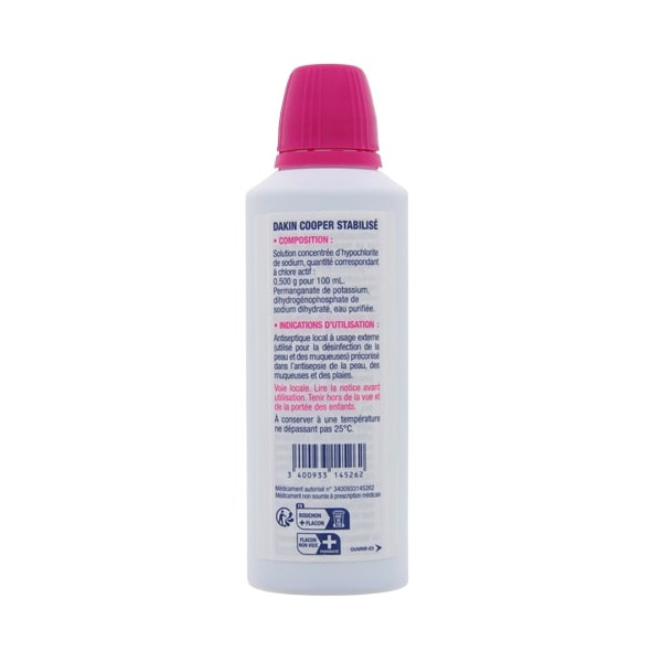 La solution pour application locale Dakin Cooper Stabilisé est indiqué pour l'antisepsie de la peau, des plaies et des muqueuses.