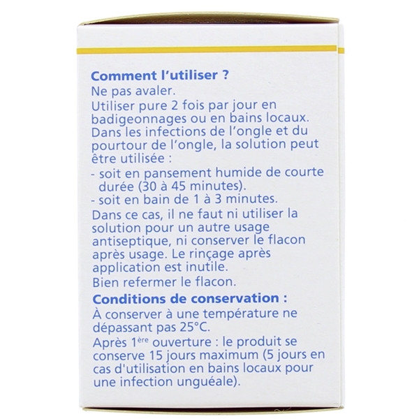 Infections de l'ongle : appliquer des pansements préalablement imprégnés de solution pendant 30 à 45 minutes ou tremper le doigt dans le flacon pendant 1 à 3 minutes. Au-delà de ces durées : risque de décollement local de la peau.