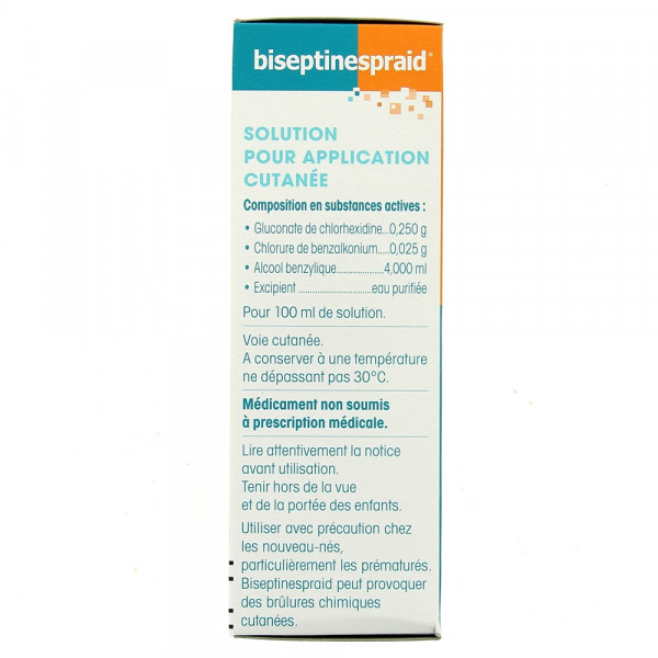 Le médicament BiseptineSpraid est disponible en ligne sans ordonnance. BiseptineSpraid est une solution antiseptique à appliquer localement pour désinfecter les plaies superficielles.