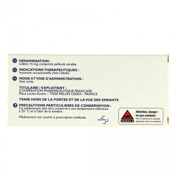 Le médicament Lidene 15 mg indiqué en cas d'insomnie occasionnelle est disponible en boîte de 10 comprimés.