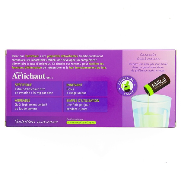 Milical Extra Artichaut Détox 7 Doses est, comme son nom l'indique, une boite de 7 compléments alimentaires buvables à base d'artichaut et ayant une saveur pomme. Les doses sont formulées à base d'ingrédients naturels afin de contribuer efficacement au processus de détoxification de l'organisme.