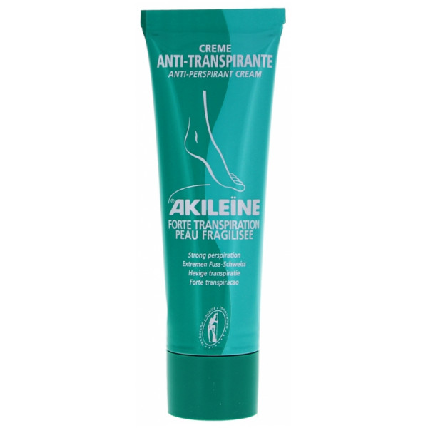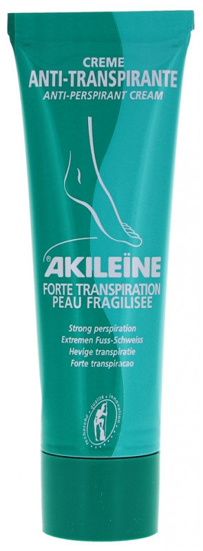 Tube contenant 50 ml de crème anti-transpirante pour les pieds Akiléïne. Ce produit est utilisé en cas de transpiration excessive et de mauvaises odeurs.