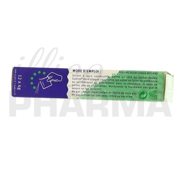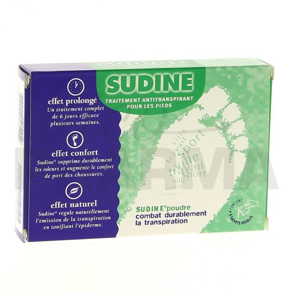 La poudre Sudine élaborée par le laboratoire Sorifa est recommandée pour les personnes qui transpirent excessivement des pieds. Elle contient des ingrédients d'origine naturelle qui agissent conformément avec le mécanisme naturel de l'organisme pour réguler la transpiration et empêcher la formation des bactéries responsables des mauvaises odeurs. Disponible en boîte de 6 sachets doubles.