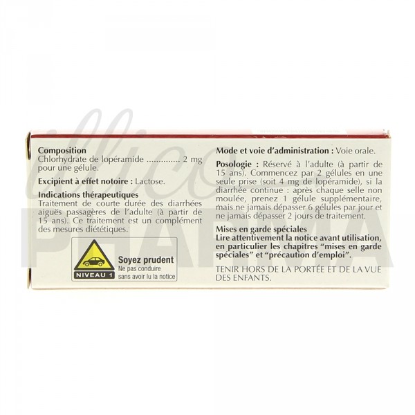 - Adulte et adolescent à partir de 15 ans : commencer par 2 gélules, puis 1 gélule supplémentaire après chaque selle liquide, sans dépasser 6 gélules par jour et 2 jours de traitement ; au-delà, si les troubles persistent, consulter le médecin.