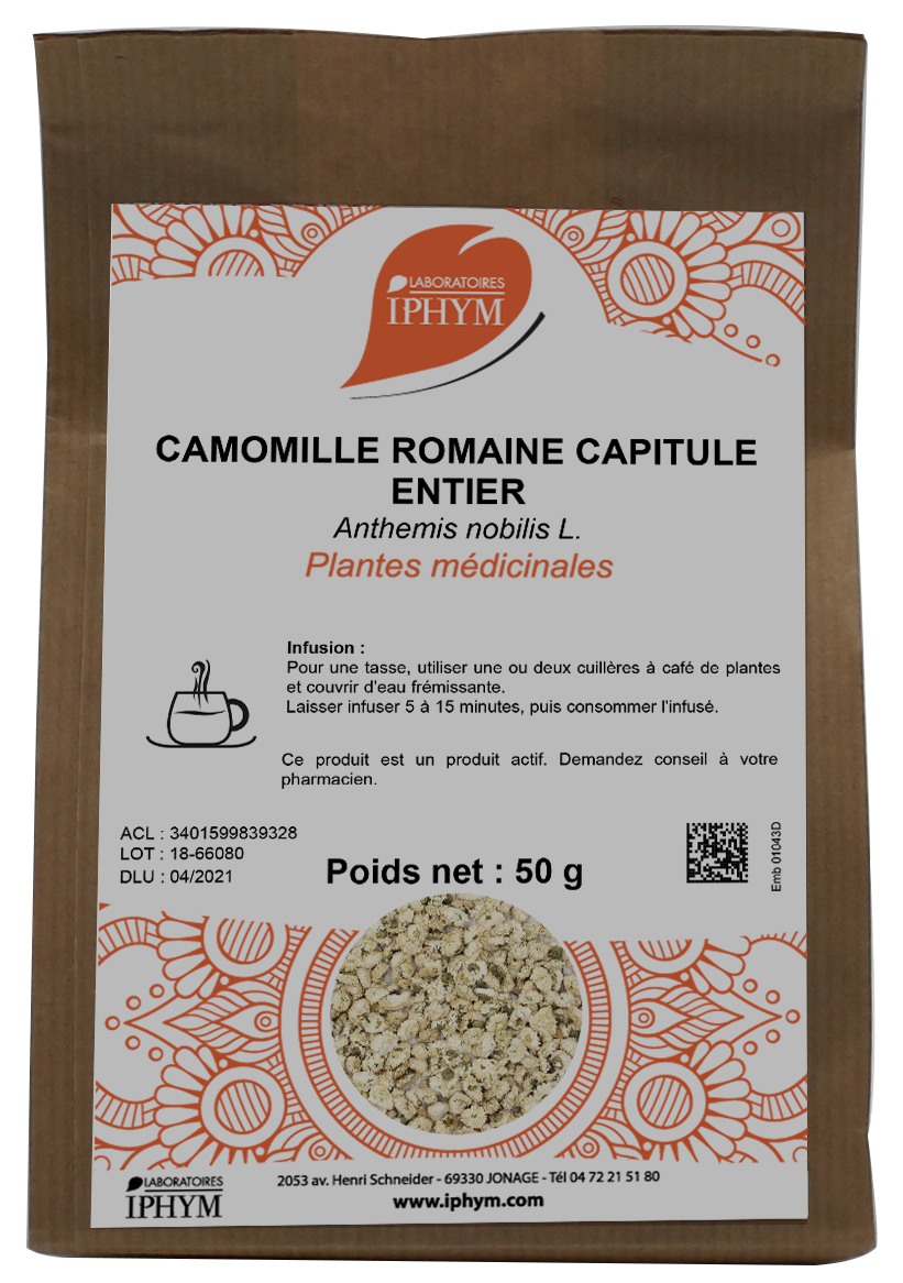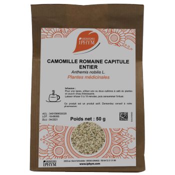 Les fleurs entières de Camomille romaine vous permettent de préparer des tisanes d'excellente qualité. Les Laboratoires Iphym proposent la tisane Camomille romaine.
