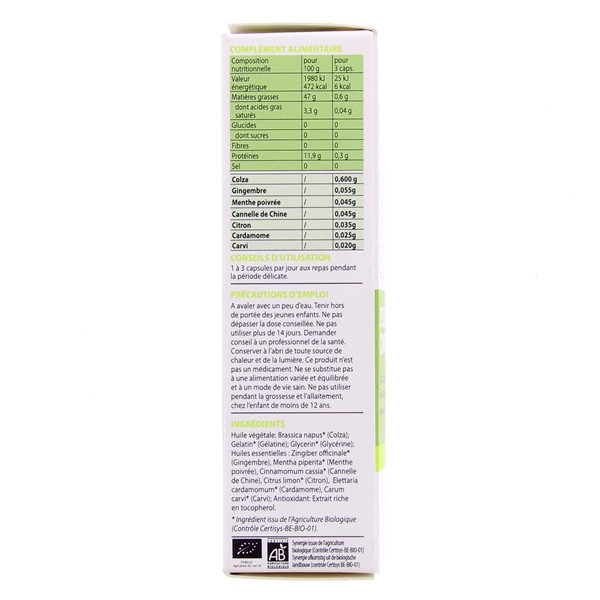 Huile végétale : Brassica napus* (Colza), Gelatin*, (Gélatine), Glycerin* (Glycérine), Huiles essentielles : Zingiber officinale* (Gingembre), Mentha piperita* (Menthe poivrée), Cinnamomum cassia* (Cannelle de Chine), Citrus limon* (Citron), Elettaria cardomomum* (Cardamome), Carum carvi* (Carvi), Antioxydant : extrait riche en Tocophérol.